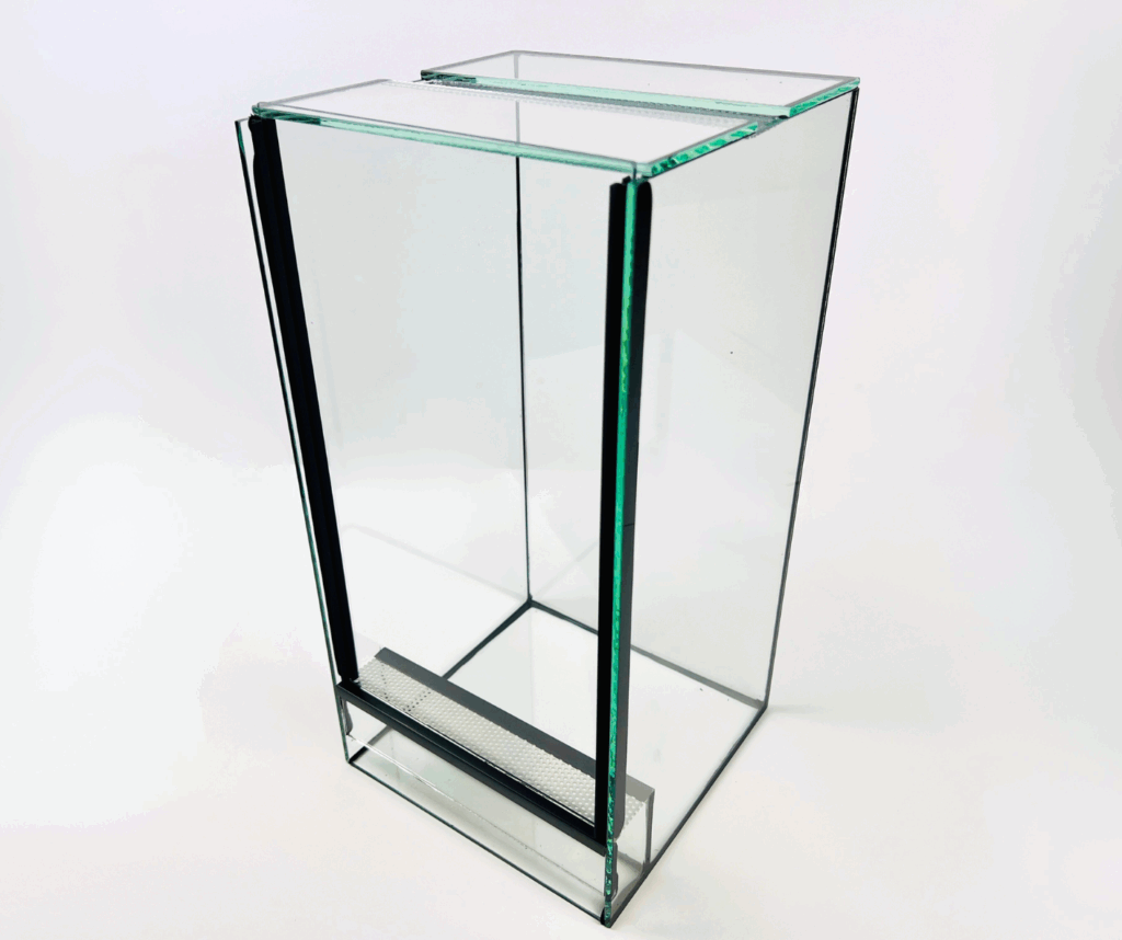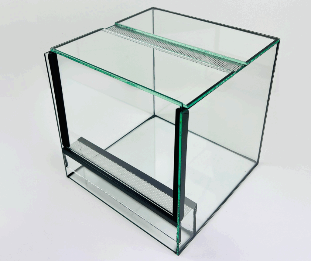 • Terraria są wyposażone w dwie wentylacje o szerokości 4 cm. Jedna wentylacja znajduje się z przodu terrarium bezpośrednio pod szybą zamykającą, druga wentylacja -w środku szerokości górnej szyby.