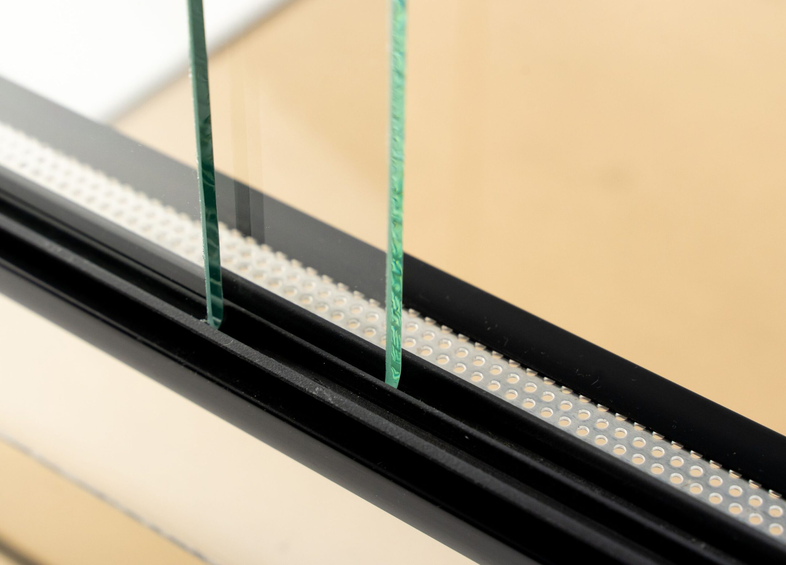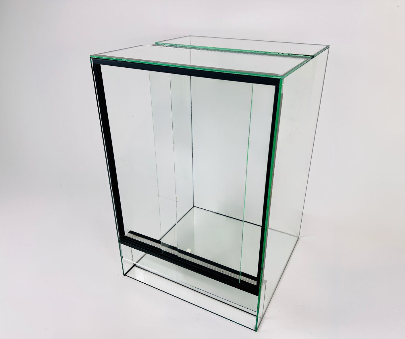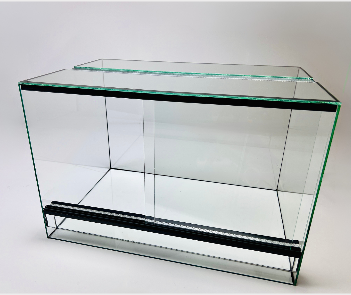 Przesuwne drzwiczki terrarium posiadają plastikową prowadnicę dwutorową, która pozwala w łatwy i szybki sposób otworzyć/zamknąć terrarium. Dodatkowo, terraria pionowe posiadają zabezpieczenie bocznych szyb, które również służy do doszczelnienia zbiornika.